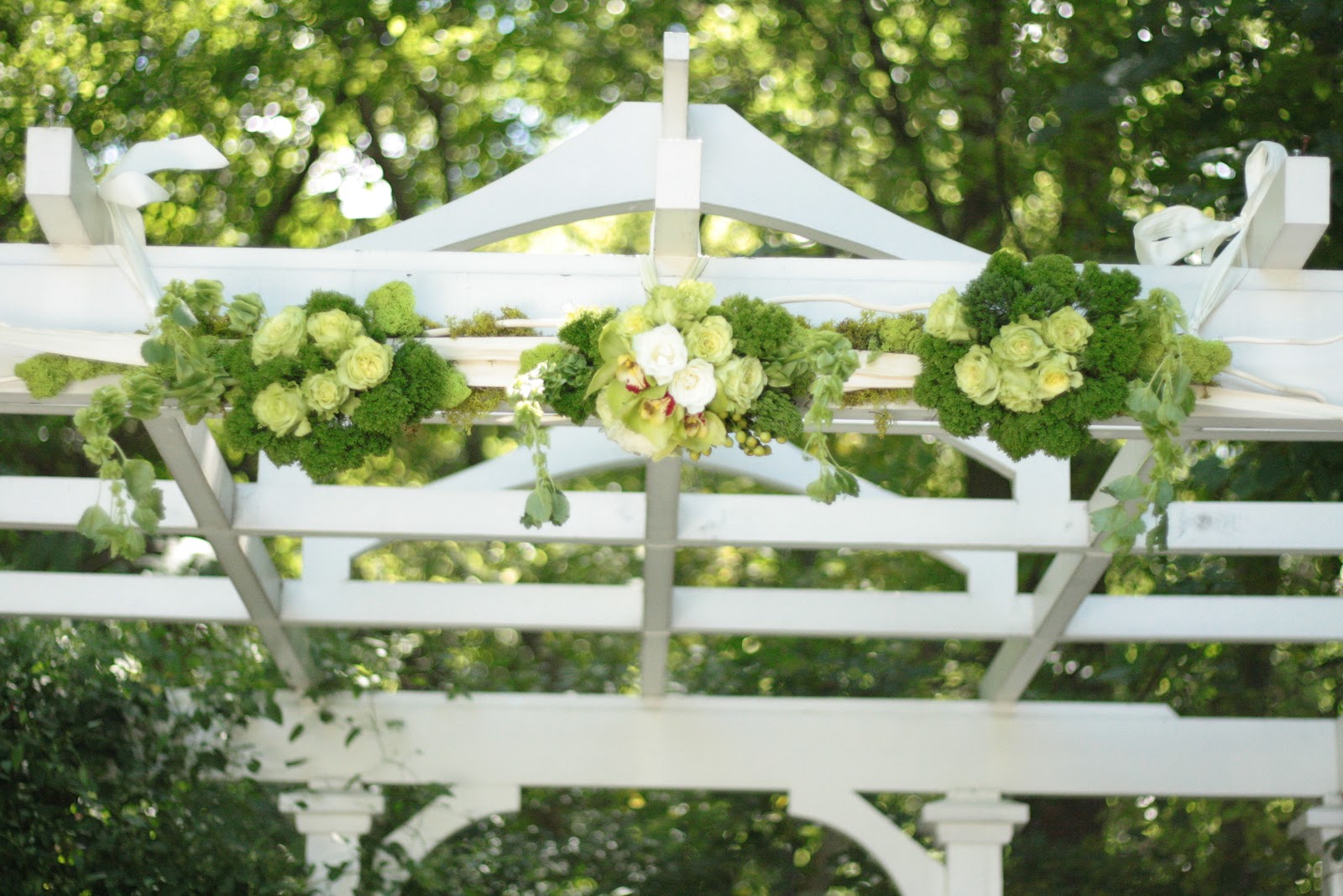 I was thinking of this large floral piece as a blessing that would hang over the couple as I made it. There were certainly a few beads of sweat produced over the installation of this piece, but advance planning won the day and my ribbon anchors worked beautifully. Phewf!!