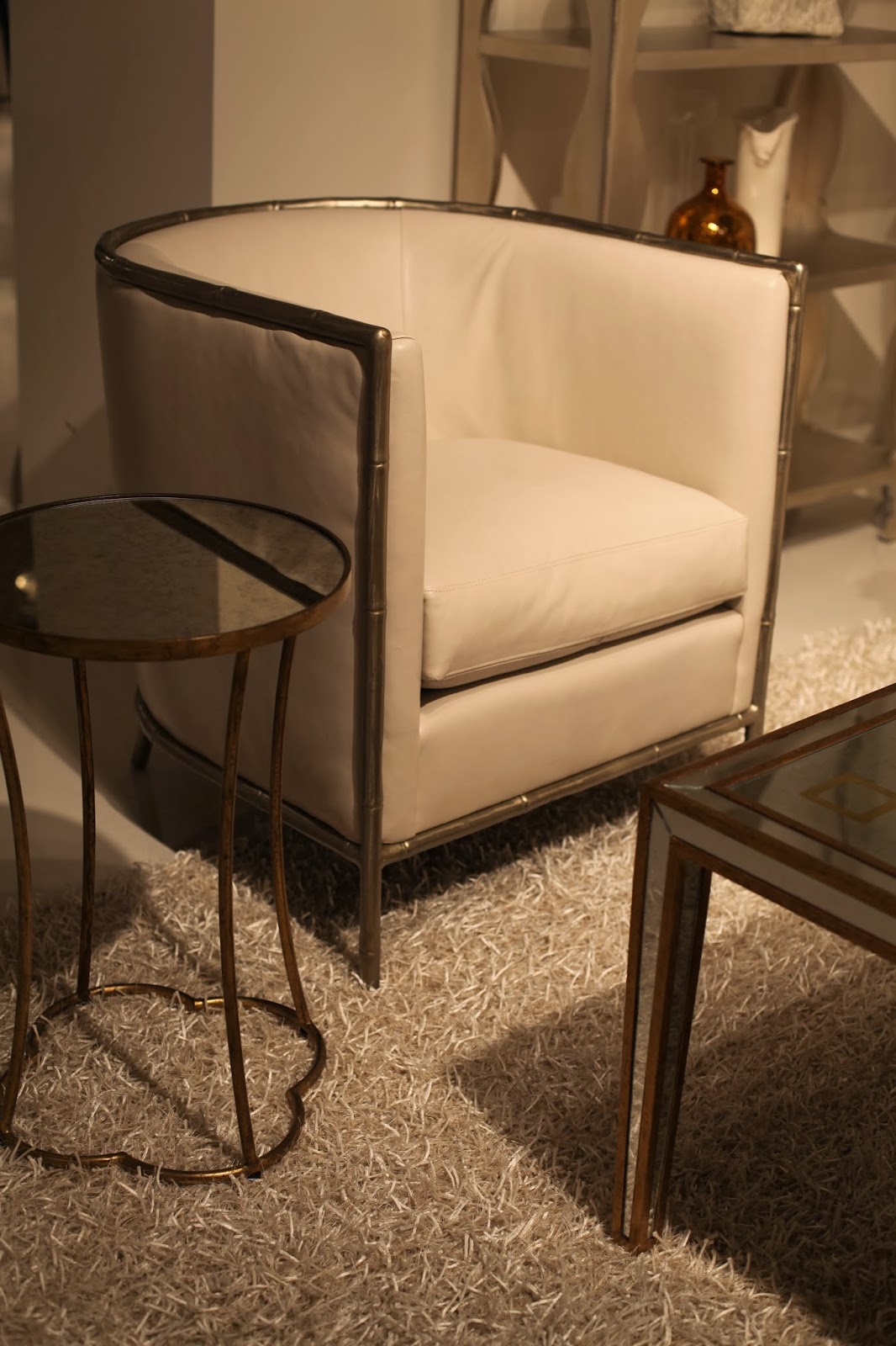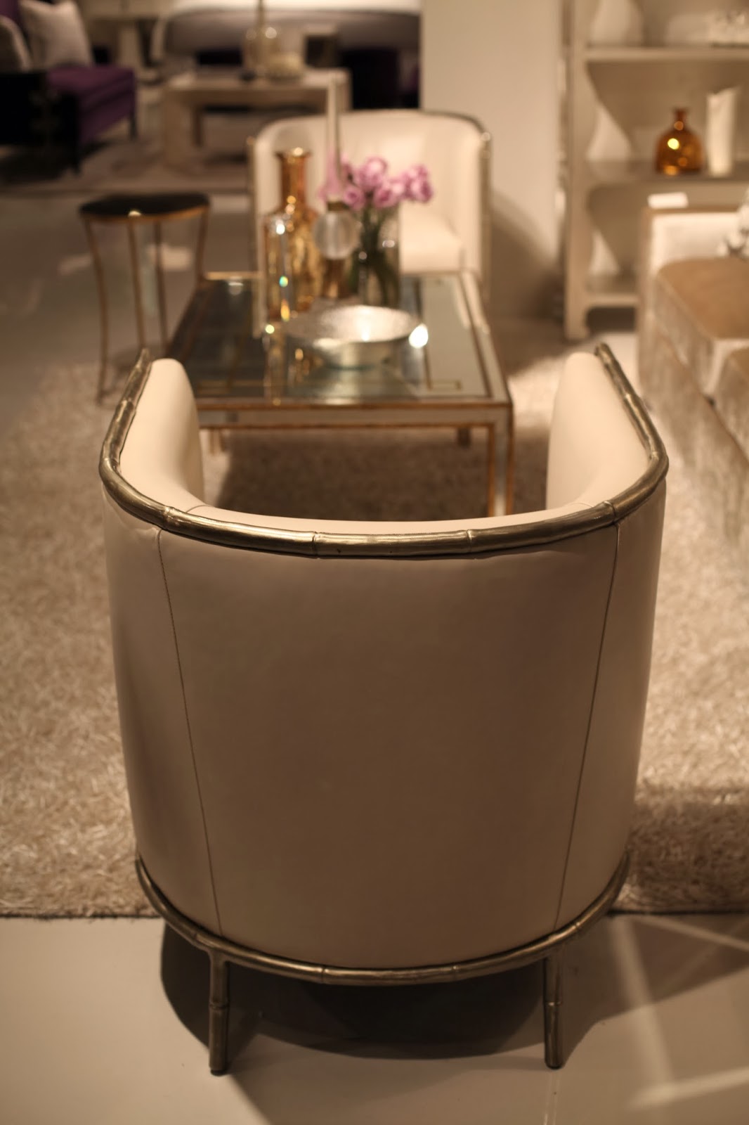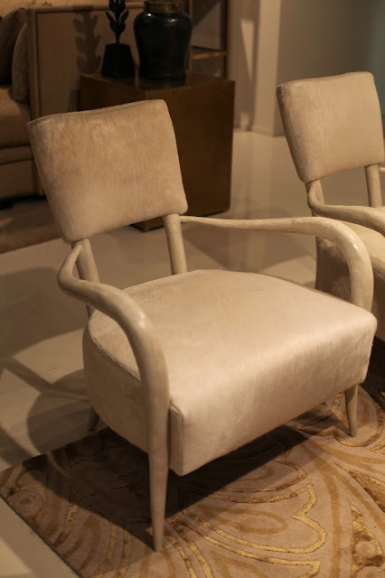 I also fell in love with this horn rimmed arm chair, shown here upholstered in hair-on-hide leather {and below in an elegant and refined warm white}. The “horn” is actually moulded resin, but the patina and finish are so realistic I found myself wondering for a brief moment how on earth Bernhardt could reproduce this chair out of natural horn so consistently!