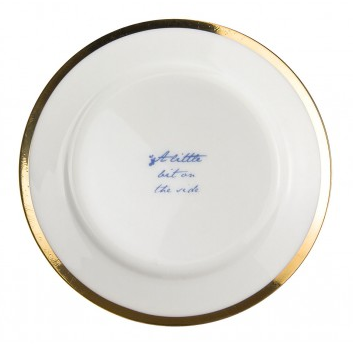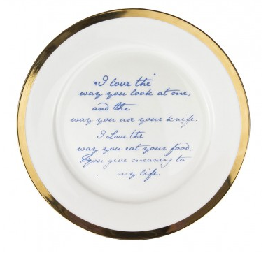 I am utterly in love with this collection of fine bone china plates. If I were a bride-to-be, these would be on my registry in a heartbeat! The large 10 inch plate features a love poem, written from the unusual and quirky perspective of the plate to you. It reads “I love the way you look at me, an the way you use your knife. I love the way you eat your food, you give meaning to my life.” The medium 8 inch plate reads “I am nothing but a simple plate, porcelain skin painted gold and blue. I am not a poet, just a dish, but I’ll leave that judgement up to you.” The small 6 inch side plate reads “A little bit on the side.” The texts are written in a romantic handwritten style of a old love letter complete with dips of ink and imperfections, and they have me utterly swooning!