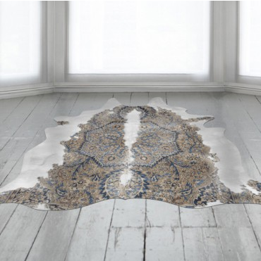 This rug is quite simply drop-dead sexy. The juxtaposition is as tasty as salty and sweet with a traditional Persian design being printed over parts of a natural cowhide rug. The result is a piece that looks as though it is revealing the true colours of this Bovine – country field wanderer by day, sophisticate by night.