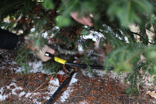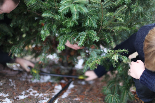 After perusing the rows with a critical eye, we spotted the Douglas Fir that would display our ornaments and shelter our gifts this year. With the saw provided by the farm, my guys set about cutting it down {to the delight of our 9 year old who felt like the embodiment of a lumberjack in that moment}.