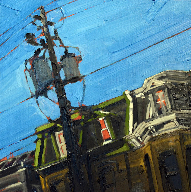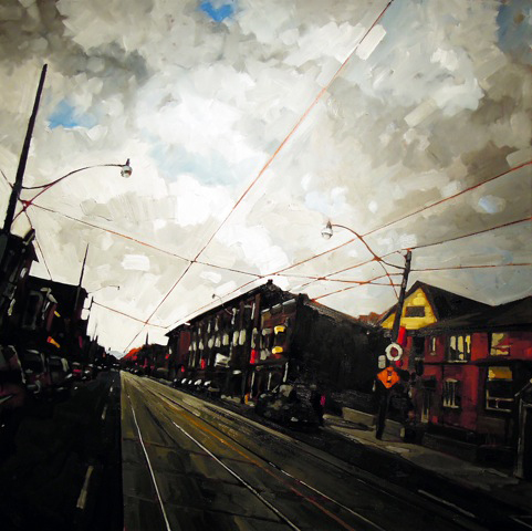 Stewart‘s work really feels like stories on canvas to me. Less taken with major landmarks, Jones seems to focus on side streets and alleys that would otherwise go unnoticed, capturing in their essence something of the secret story of the city. I want to know who lives up that alley, who just took a walk down that street with their sweetheart, and what were they talking about? Who makes these streets come alive with the hum and electricity that makes Toronto so unique? It’s almost as though Jones’ paintings are figurative, the city as his subject, and he invites us to explore the depth and breadth of all she has to say to us.