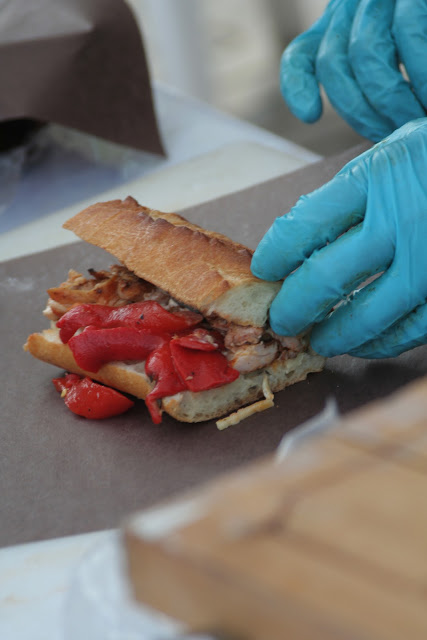 Chicken, brie + roasted red pepper sandwiches on Ace Bakery baguettes from Santaguida Fine Foods.