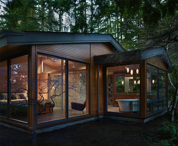 This last one – a wood and glass structure by Finne Architects of Seattle – feels as though it was magically dropped down into the middle of the woods. I love the massive skylights flooding the centre of the space with natural light. The simplicity of the wood, stone and glass seem a perfect framework to the picturesque landscape from inside and the refined elegance of the structure’s interior from the outside.