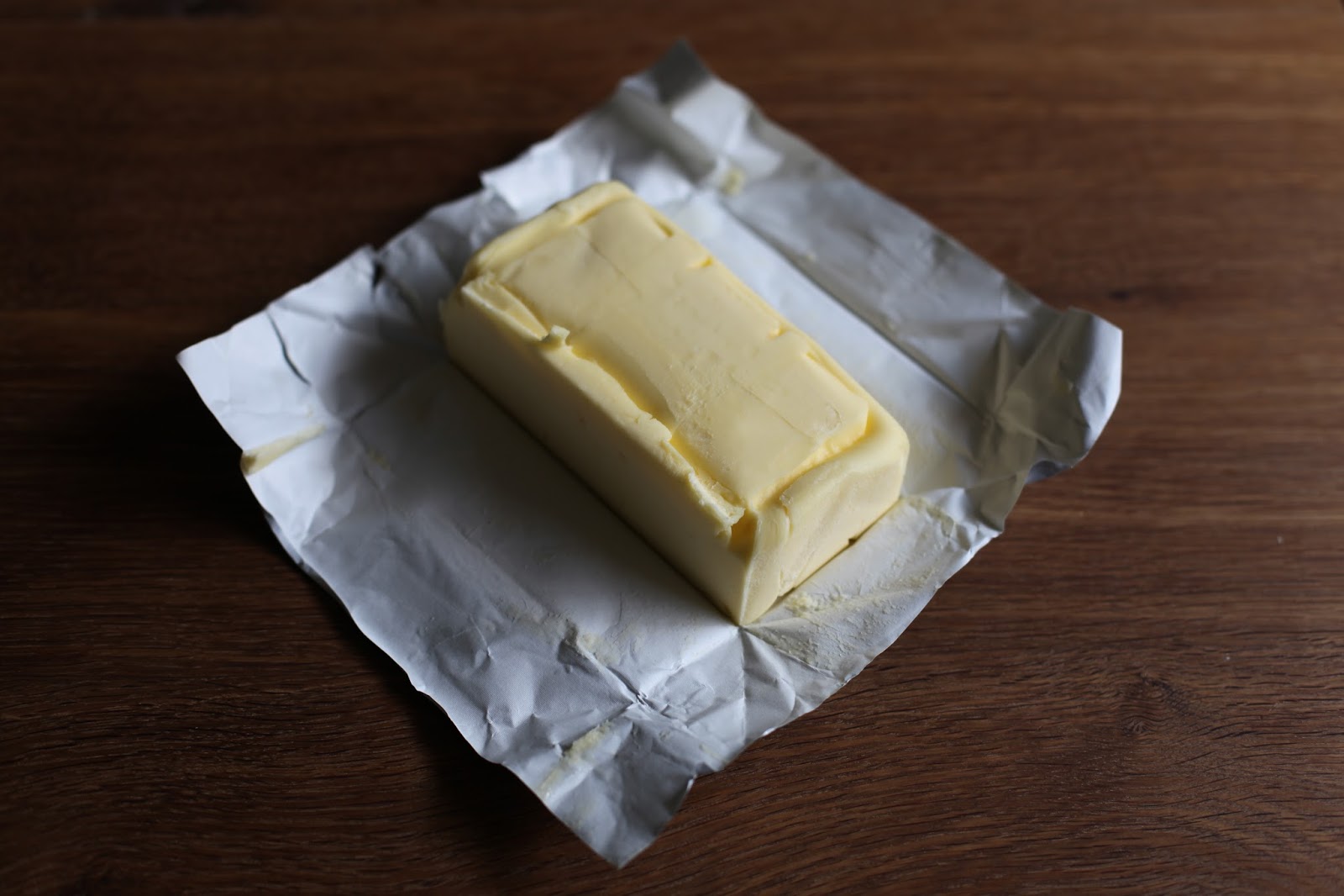 Start by taking a cold, 1 cup block of butter {this is a half-brick} from the refrigerator and cutting it into small cubes. Place the cubes in a freezer-safe container and freeze for a minimum of 10 minutes {up to an hour}.