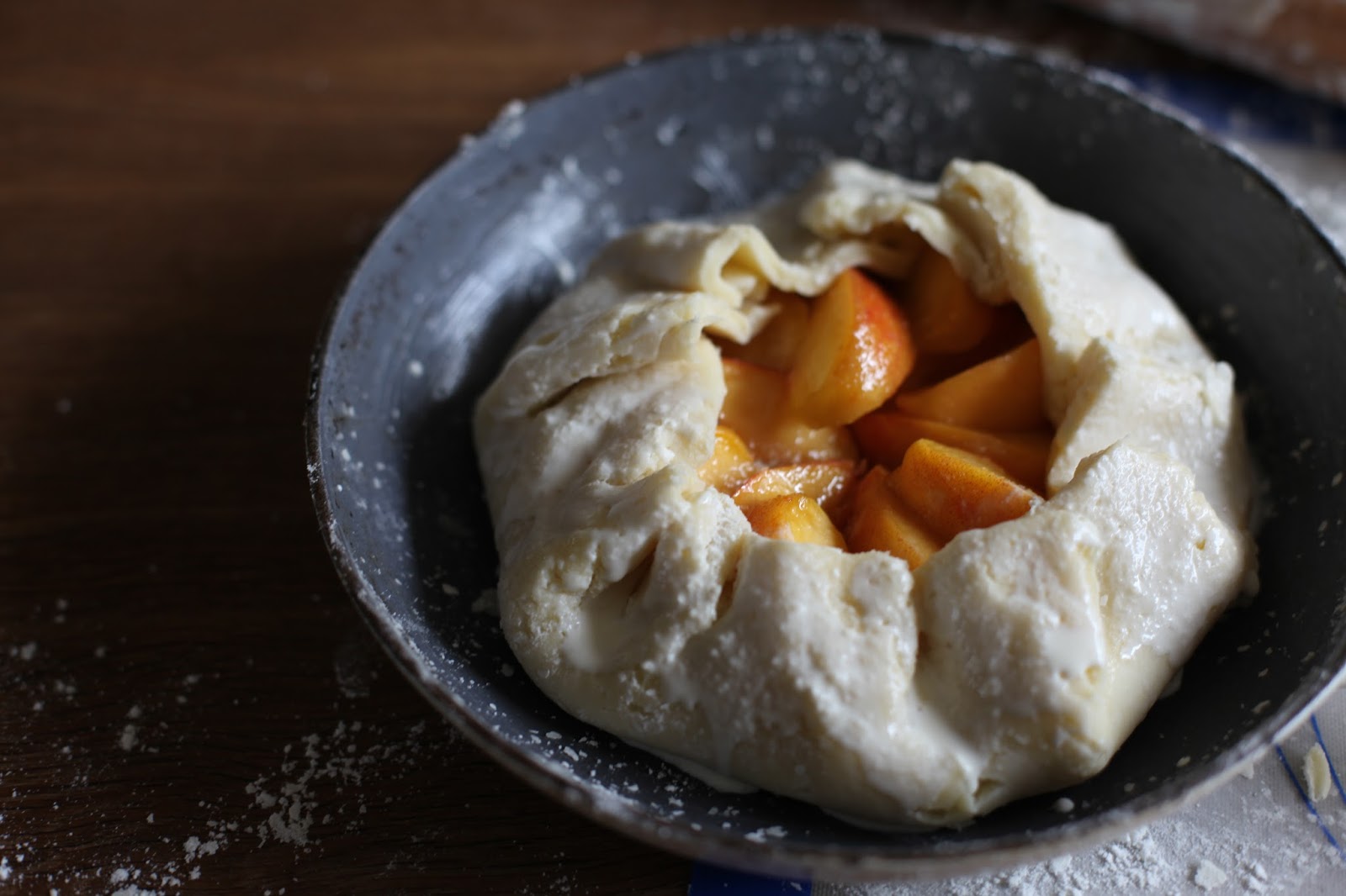 Next, slice your peach and arrange the slices to gently fill the crust with room to fold over the edges. Dust the peach slices with maple sugar and then carefully fold the edges in to nestle around the fruit.