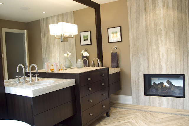 Yesterday I shared Part 1 one of one of my favourite clients’ bathroom renovation projects, revealing some of my secrets to creating interesting texture with the use of tile. Today I’m excited to share with you the cabinetry design and the 2-way fireplace “big reveal.”