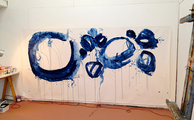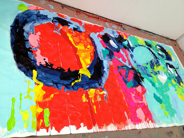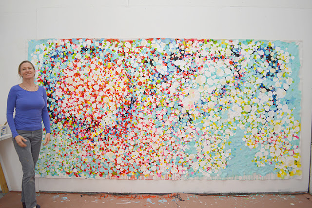 Today’s inspiration is a voyeuristic entrée into the world of process, thanks to abstract painter Claire Desjardins. Her work entitled “Supersize” was the result of an unfettered month spent in artistic retreat at the Vermont Studio Center. Most gratefully, she documented the evolution of this massive piece.