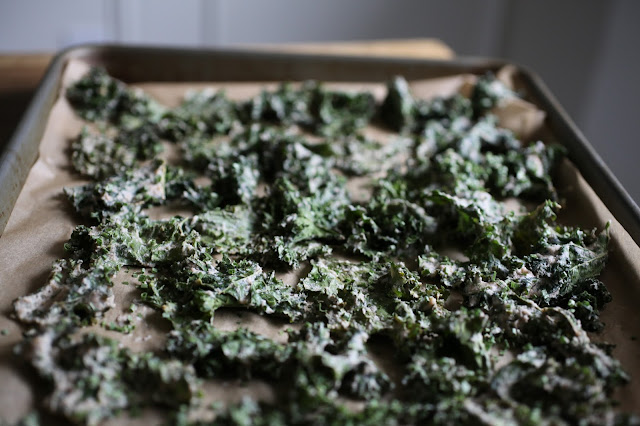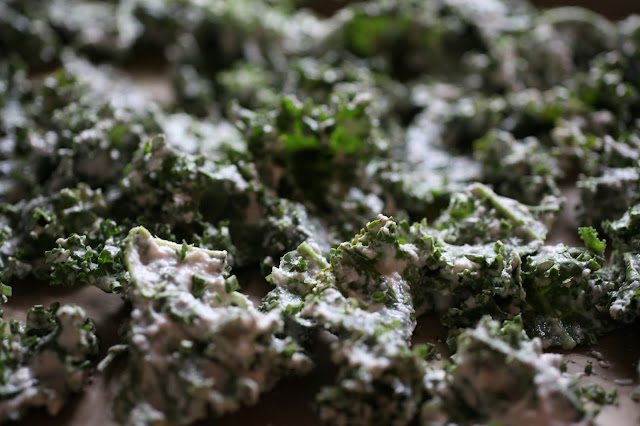 Toss over the kale until it is thoroughly coated. Spread the kale out onto non-stick baking sheets in a single layer. {Sarah’s side note: I used 2 full heads of kale for the amount of coating produced and spread it all out over 3 cookie sheets lined with parchment.} Dehydrate at 105 F {41 C} for 10-12 hours or until cripsy. {Sarah’s side note: I discovered my oven has a dehydrate setting!! Amazing!! If yours doesn’t, you can pick up a dehydrator online and will want to crisp them up this way to preserve all of the raw enzymes and nutritional goodness packed into the kale.}