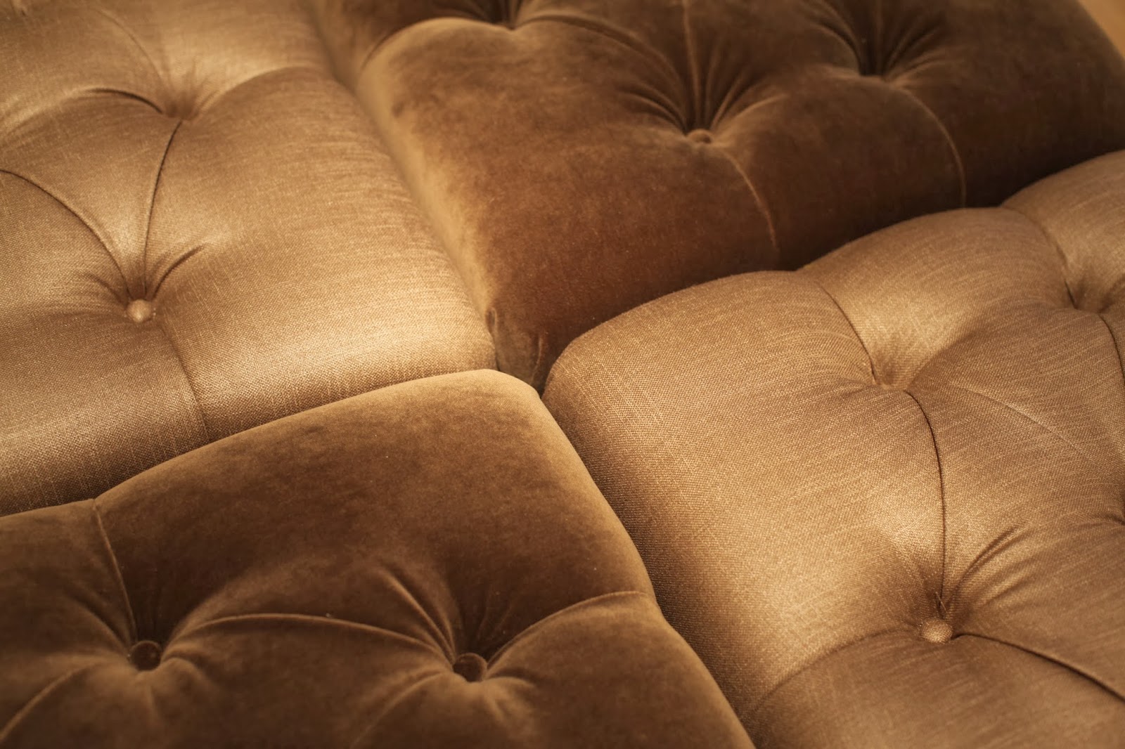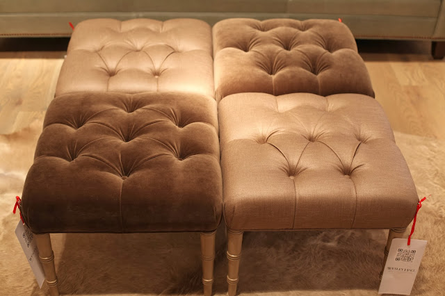 FOUR: The Dunham Bench? Well, she’s got legs, and she knows how to use them. Between her leggy details, her button tufting and the gorgeous trim details {all customizable, of course} she is my kind of girl. I also fell in love with her kissing cousin, the Dunham Ottoman {shown below bunched as a group of four for a flexible, functional and fabulous alternative to a coffee table. Don’t you just love the contrast between the velvet and the linen? Yummy.}.