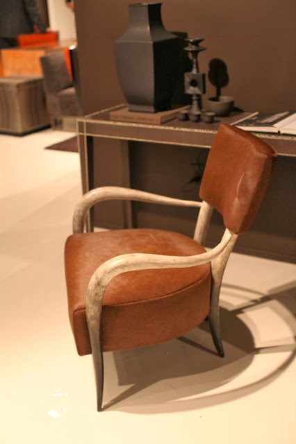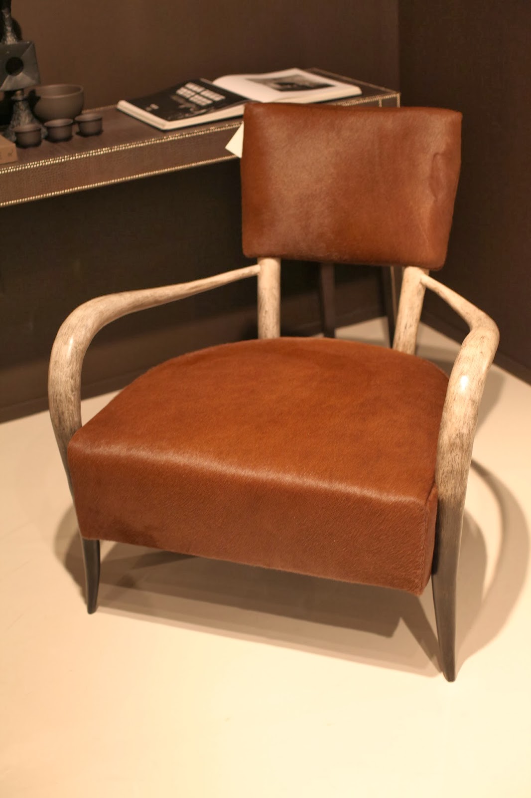 I also fell in love with this horn rimmed arm chair, shown here upholstered in hair-on-hide leather {and below in an elegant and refined warm white}. The “horn” is actually moulded resin, but the patina and finish are so realistic I found myself wondering for a brief moment how on earth Bernhardt could reproduce this chair out of natural horn so consistently!