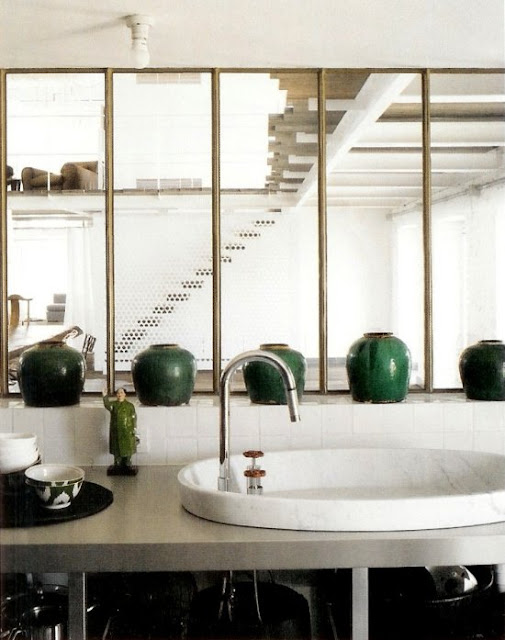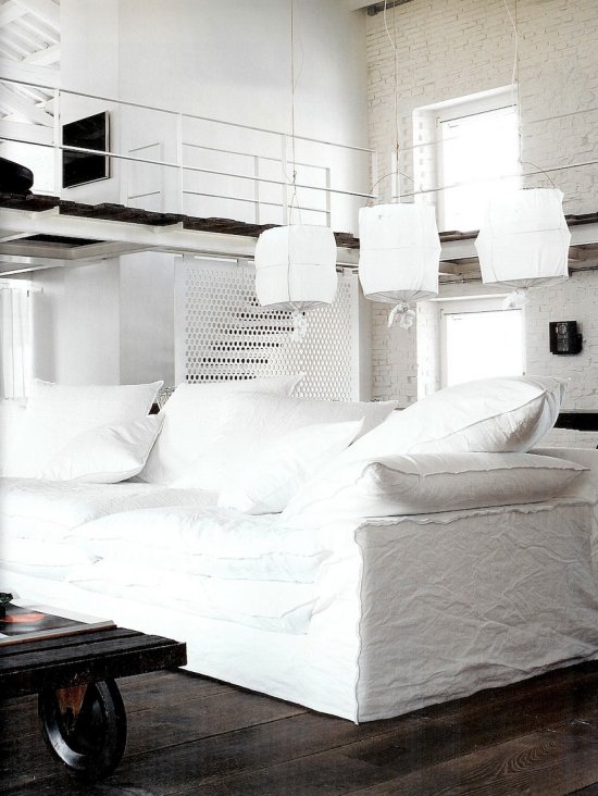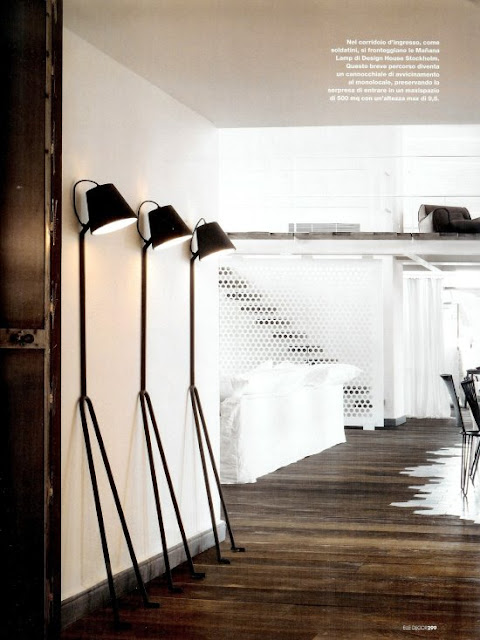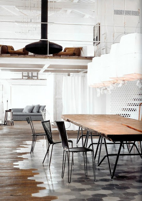 Some of my favourite details? The bones of the space itself are tear-worthy, from the rustic, wide-plank floors to the soaring ceilings to the exposed brick and endless bath of natural light. The oversized Carrara Marble honeycomb stone floor inset in the dining room made me gasp a little. And I simply adore the lamps shown above, reminiscent of some school friends casually leaning against the wall while having a chat at recess.