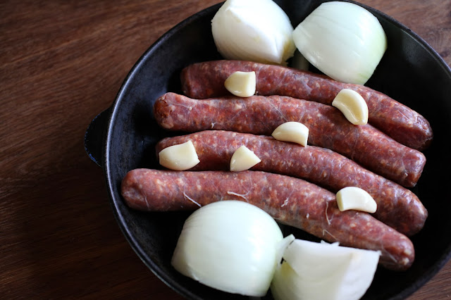 Place sausage, onion and garlic cloves in an open roasting dish and bake in 375˚F oven for 30 minutes, turning once after 15 minutes. {I was lazy and chopped my onion and garlic after they were roasted, but you can definitely chop yours before roasting.}