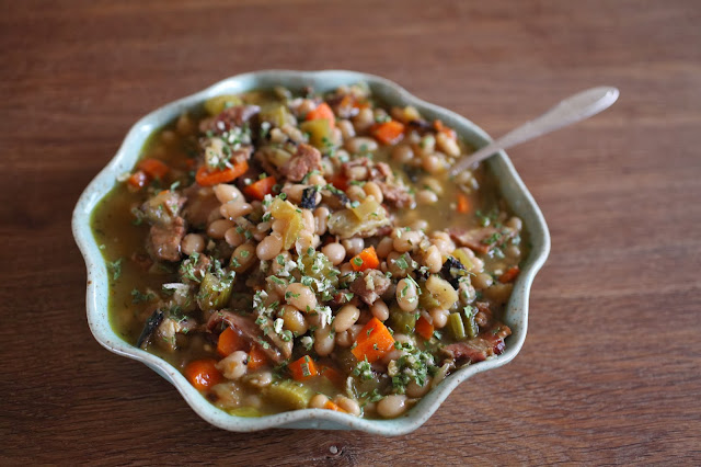 After soaking beans in water overnight, rinse thoroughly and simmer in chicken broth, wine and herbs in a large stock pot for 1h. Meanwhile, lay out bacon slices on a cookie sheet {or two} and bake at 375˚F for 10-15 until browned but not too crispy.