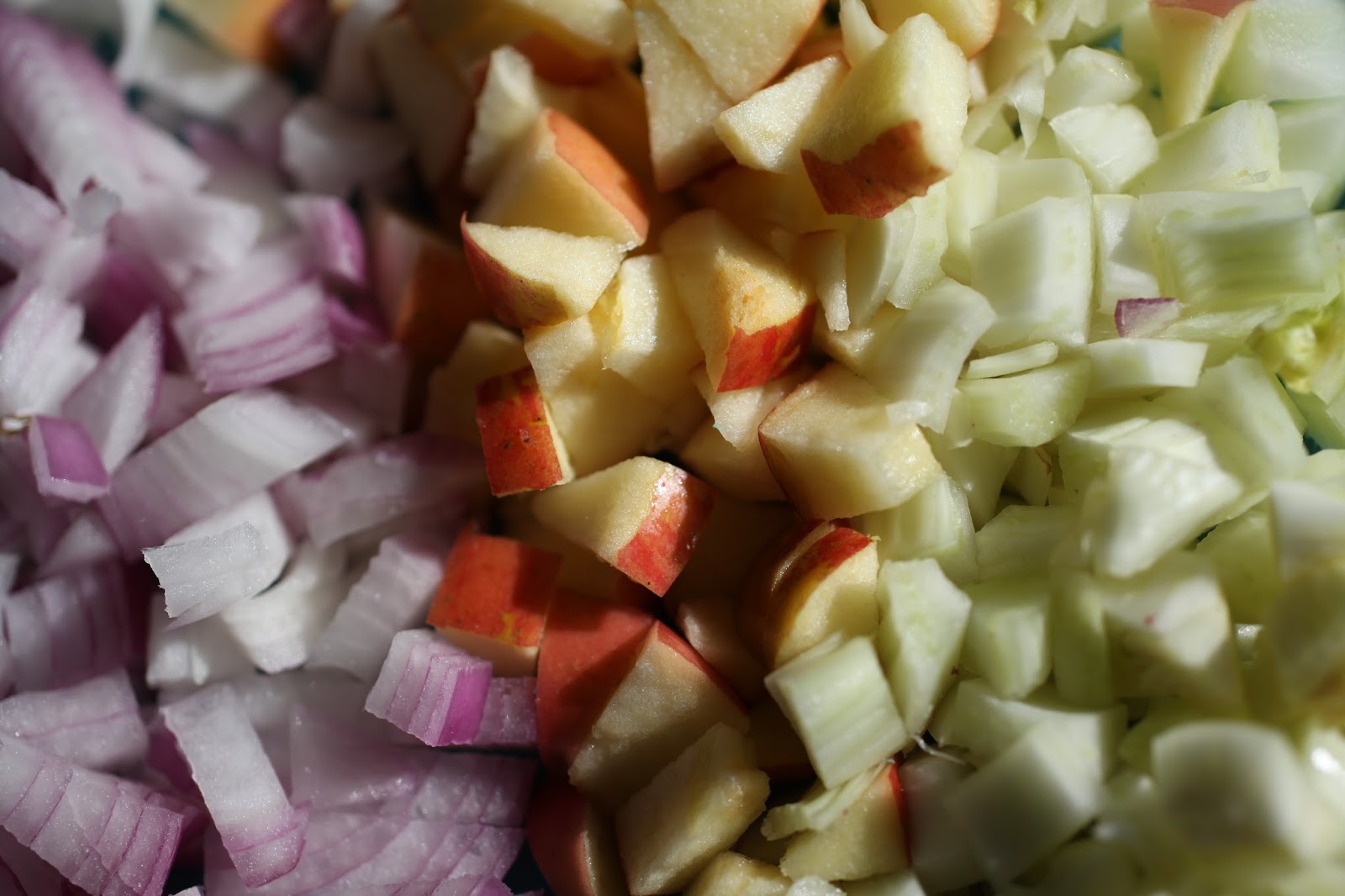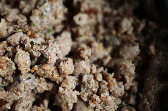 Anyway, this meal really hit the spot, so I thought I’d share it with you today just in case any of you are experiencing climate confusion and related symptoms of foodie angst. As always, the core ingredients are really simple: spicy Italian turkey sausage, bacon, apple, fennel, onion, thyme, garlic and parmesan cheese all stuffed into the humble green delivery system of carved-out zucchini.