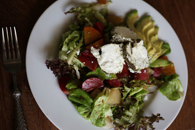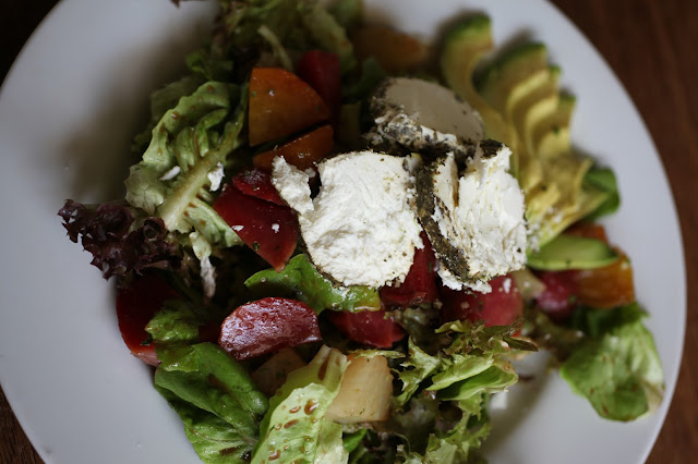 I just sliced a quarter of one up and added it to the plate, topped the salad with three chunky slices of herbed goat cheese {I love me some chévre!} and voilà! A simple and delicious {and not-so-secretly really good for you} summer salad.