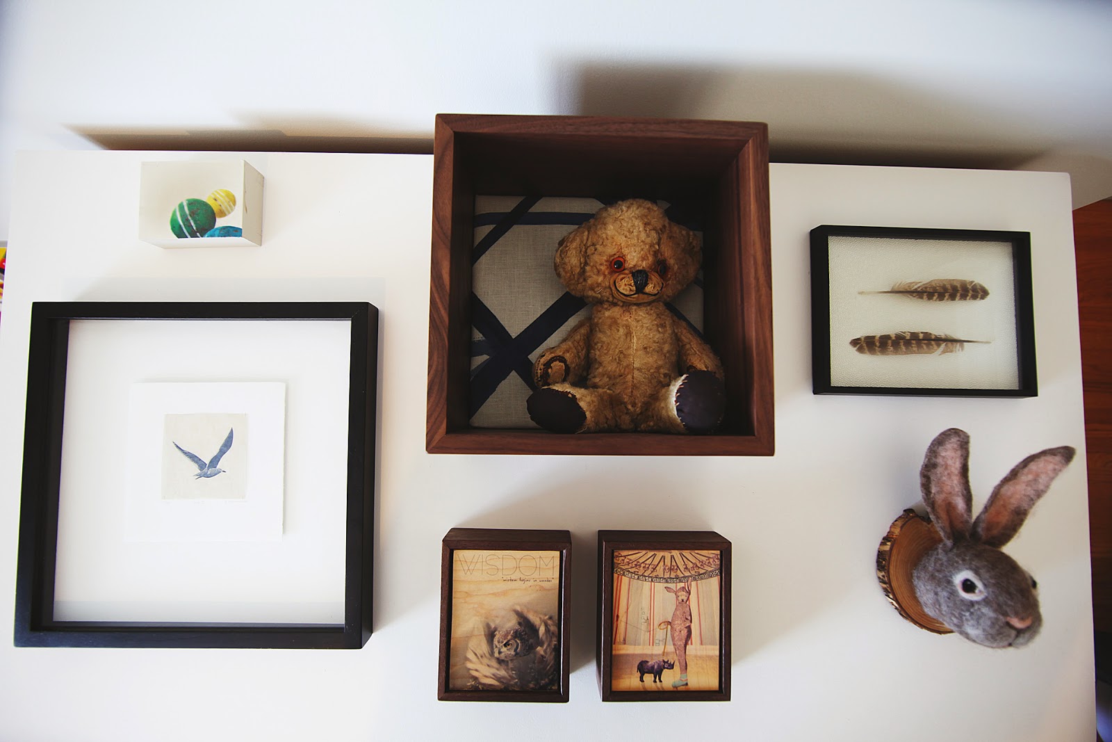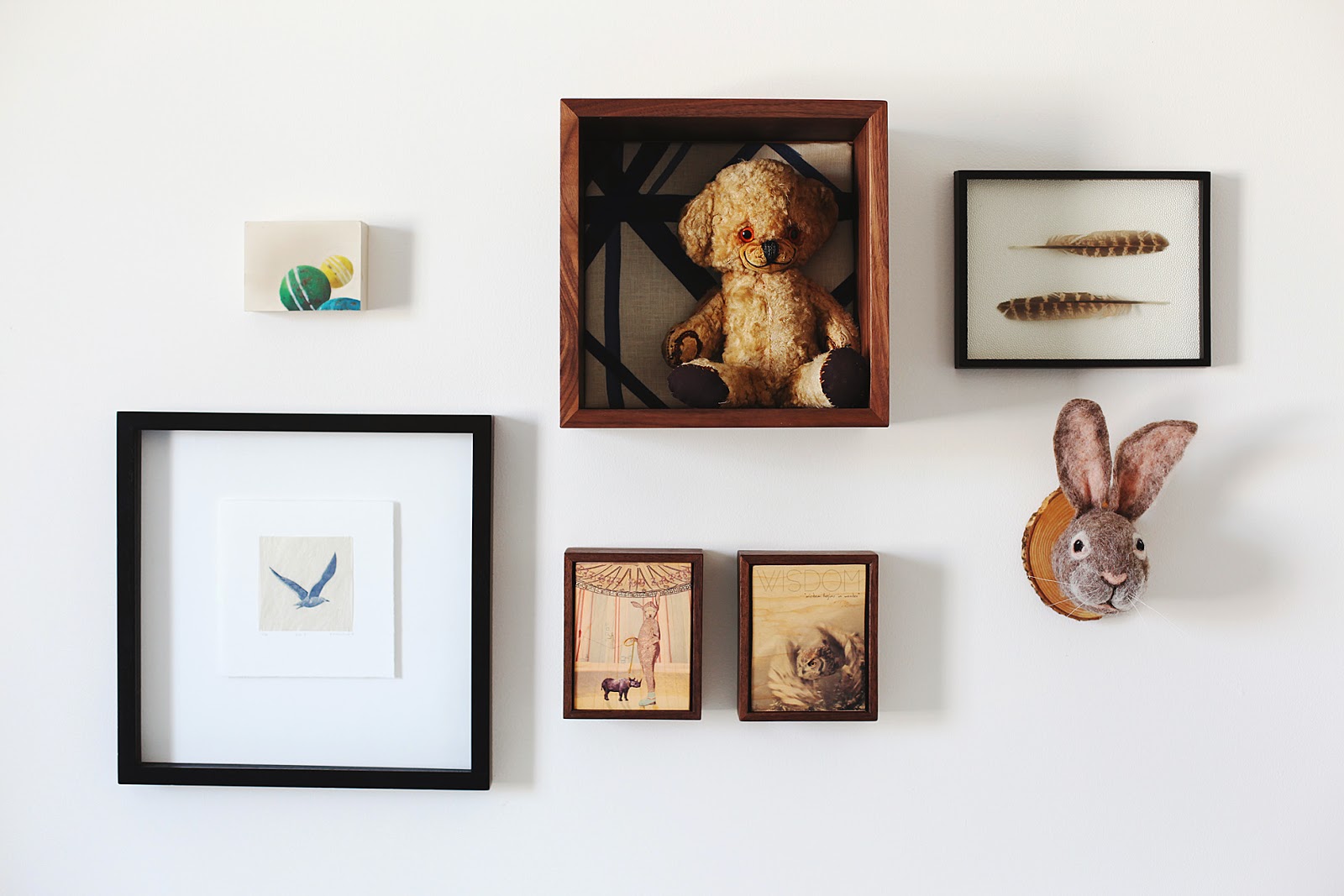 Once the central piece was installed, we moved on to installing the two whimsical wood prints from Big Bear’s Den that I picked up at this year’s Christmas One of A Kind Show. I once again had my furniture maker craft the frames for these two little lovelies {which he then generously gave me as a Christmas gift! People are so kind!}. I’m thrilled with the result and love the way the walnut frames create a sense of warmth and connect with the wood on the change table/dresser. He made the frames to be installed with a wood block cleat on which to hang, and I love how stable this makes them. {See Graham installing the wood blocks above.}