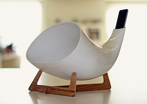 This passive {aka not powered} ceramic amplifier uses natural acoustics to optimize the best sound output from your iPhone. The simple wooden base allows the megaphone to float off the surface, thus increasing the vibration of the ceramic horn, optimizing the sonics.