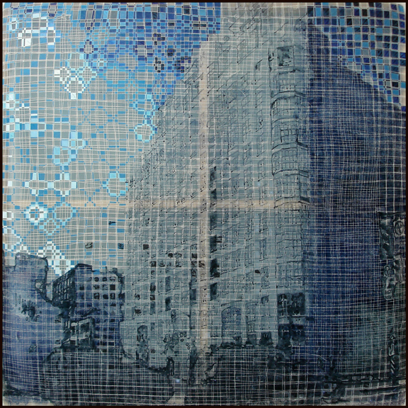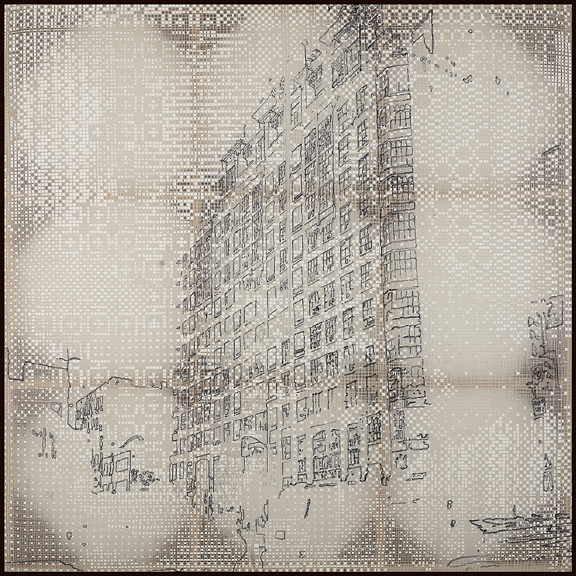 Simpson’s “reverse weaving” may be an ancient technique, but the result is entirely modern and edgy, almost pixelating the images and layering together concepts and statements through her subtle yet surprising manipulation of the canvas.