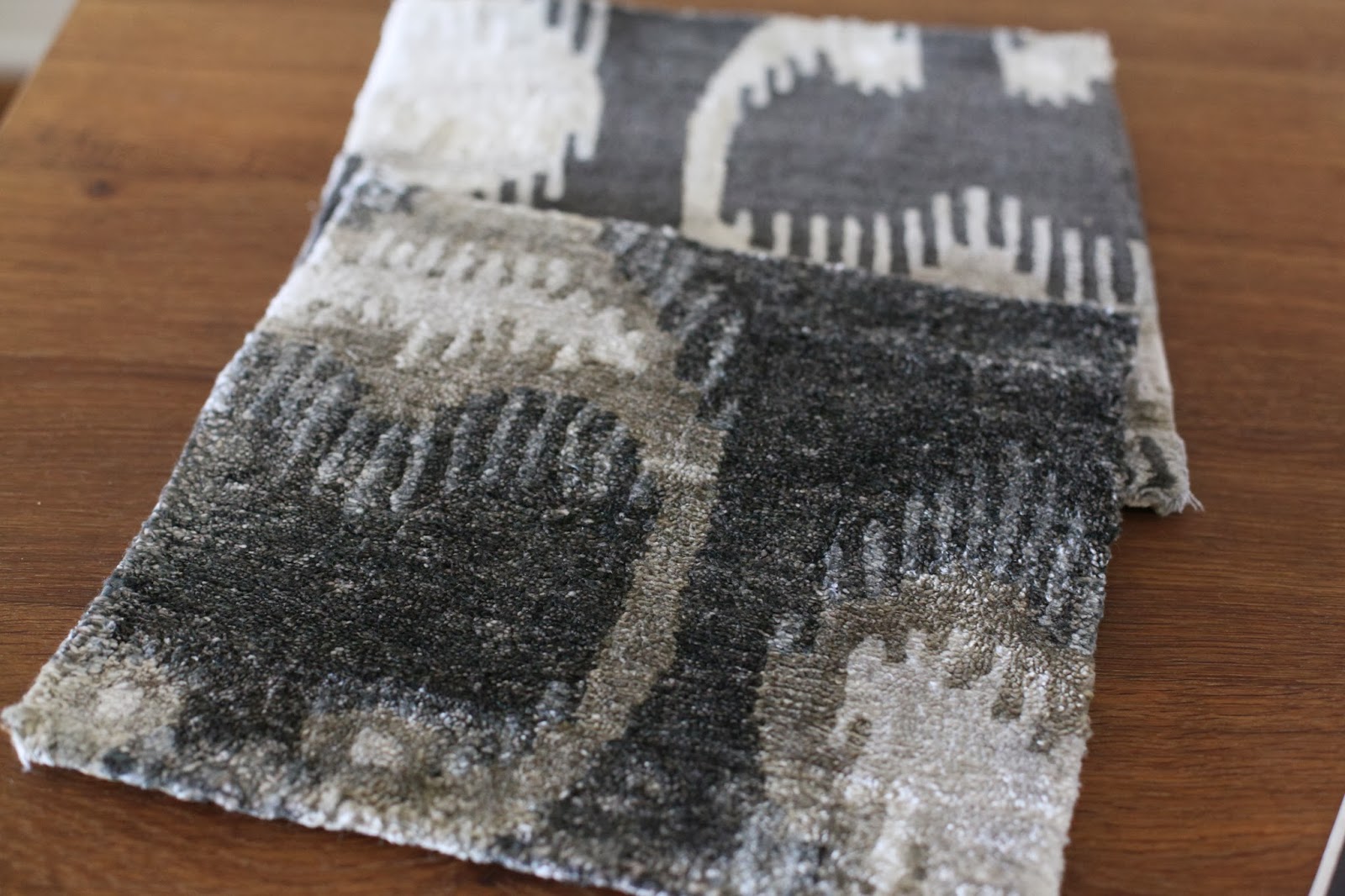 In fact, we’ve already got our strikes back! Strikes are samples that are made up before finalizing the order for a custom rug. Allan has taken very good care of us as usual. We fell in love with a more contemporary feeling Ikat pattern and customized the palette on site at the Lake House using wool and silk poms to reference the colours in the floor. We chose to have two strikes made up – one a combination of wool and silk, and the second 100% pure bamboo silk.