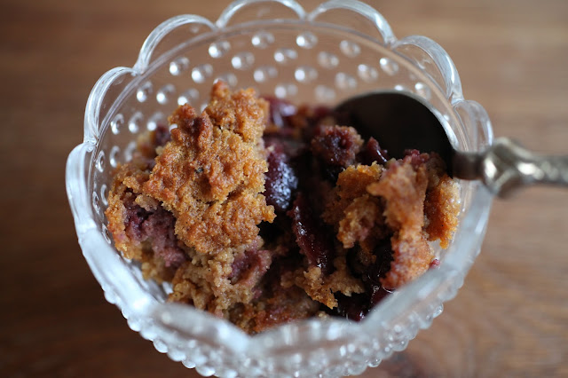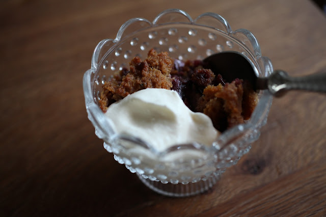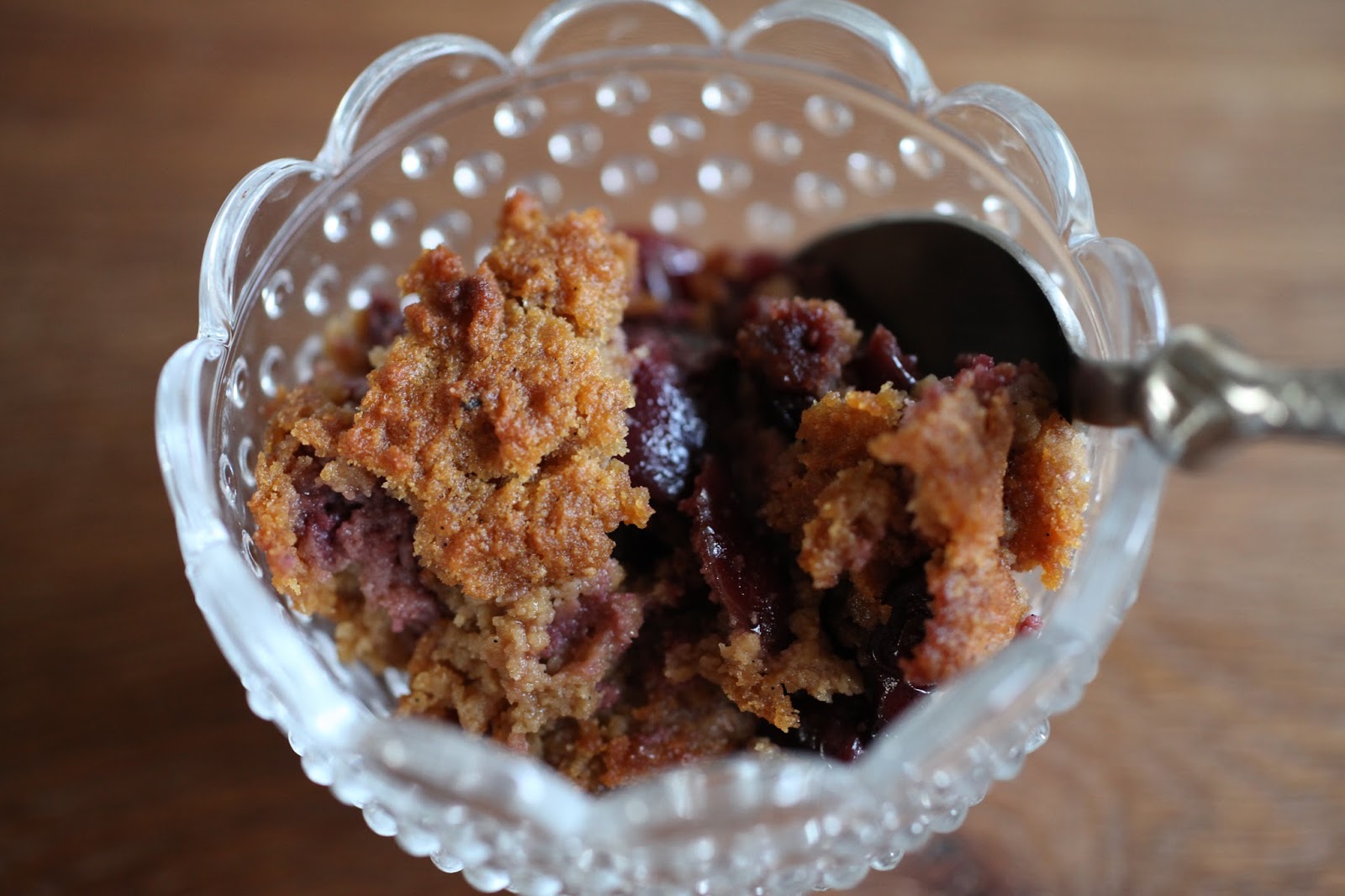 I then cut the cherries in half and macerated them in brandy and coconut sugar for just over an hour {fear not: quantities will all be revealed in the recipe below}.