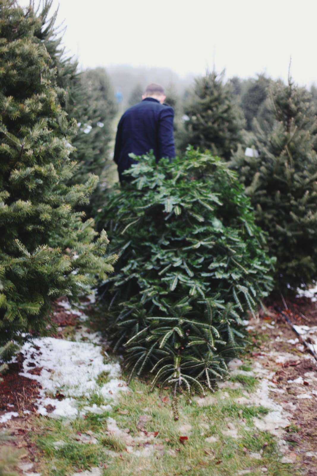 After perusing the rows with a critical eye, we spotted the Douglas Fir that would display our ornaments and shelter our gifts this year. With the saw provided by the farm, my guys set about cutting it down {to the delight of our 9 year old who felt like the embodiment of a lumberjack in that moment}.
